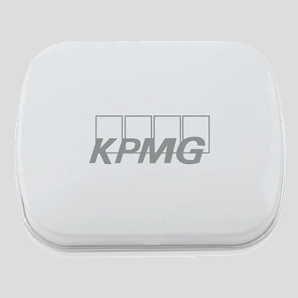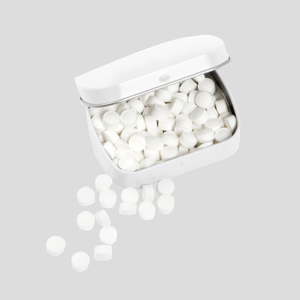 Boîte bombée contenant des bonbons à la menthe blancs et argentés