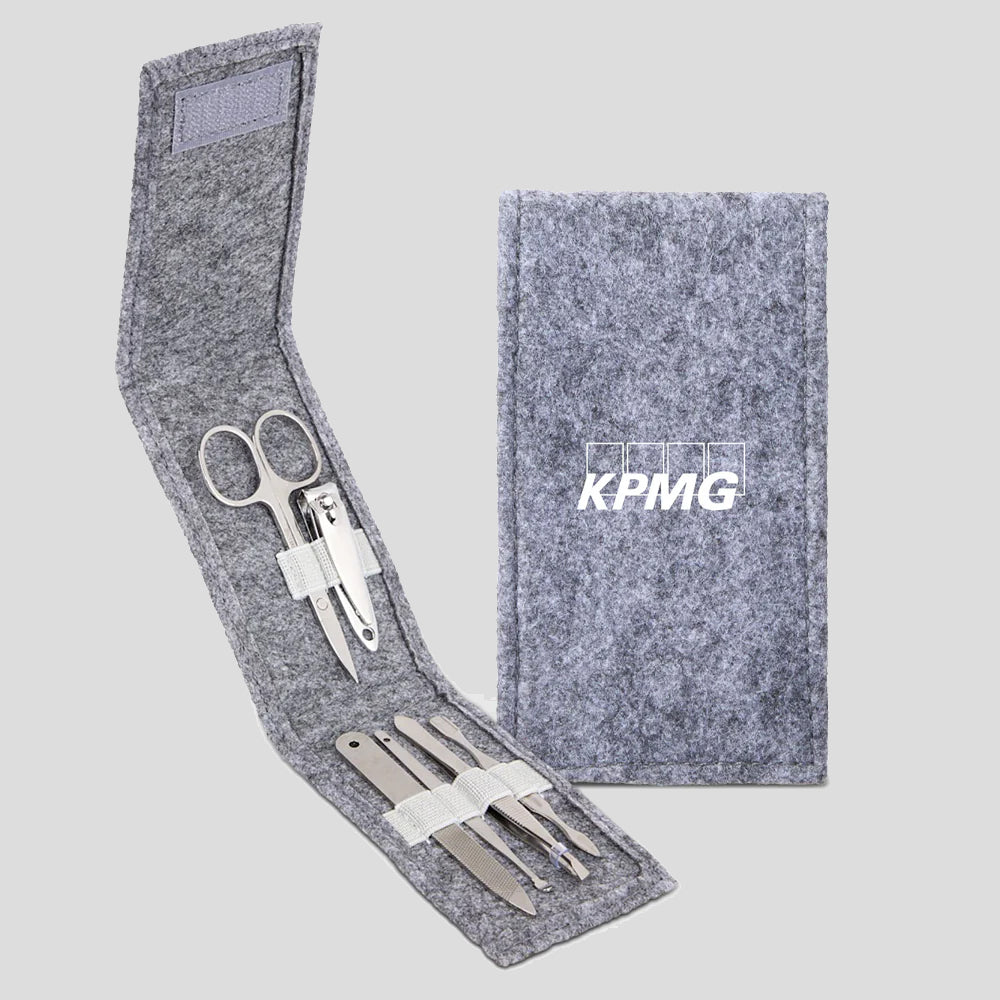 La collection en feutre recyclé The Goods utilise un matériau tendance et résistant pour mettre en valeur votre marque. Le kit de manucure 6 pièces en feutre recyclé The Goods comprend des ciseaux en acier inoxydable, un coupe-ongles, une lime à ongles, un outil de nettoyage des ongles, une pince et une spatule, le tout dans un étui en feutre PET recyclé écologique. Des élastiques maintiennent les outils en place et une fermeture auto-agrippante assure une bonne tenue. Commande minimum : 150 pièces.