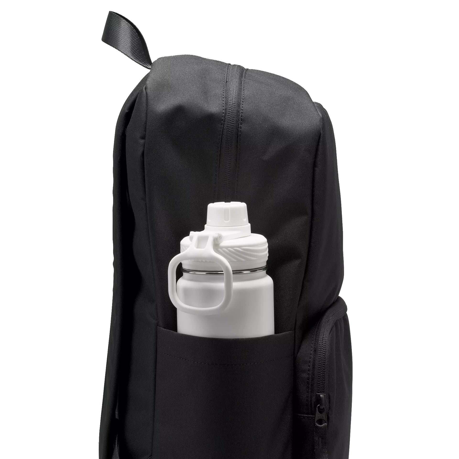 Interior padded pocket fits a 16" laptop. Spacious, front zippered pocket with side pockets for quick access to water bottle and small items. A zippered main compartment